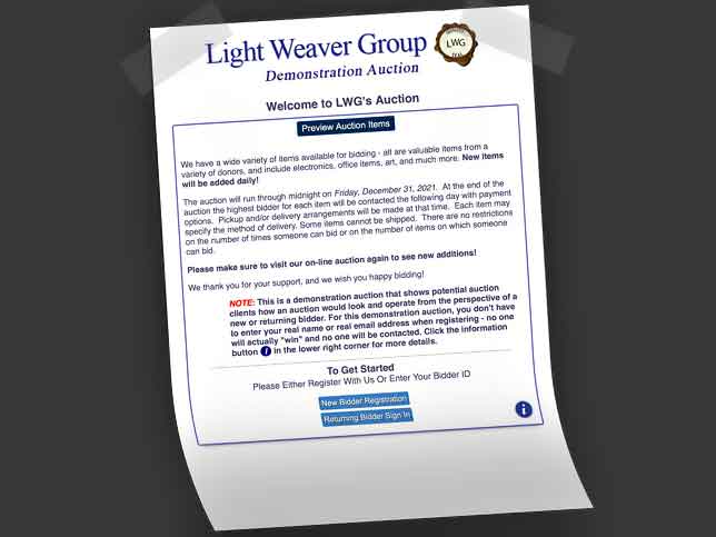 First developed in 2003 as a speculative fundraising process for a client, our online auction system has matured into a commercial offering that is available to non-profits, religious groups, schools, colleges, and universities who want to run a limited term (up to 30 days) inexpensive (auction costs starting at $50) do-it-yourself online auction. It is now marketed by Auction Crafters.